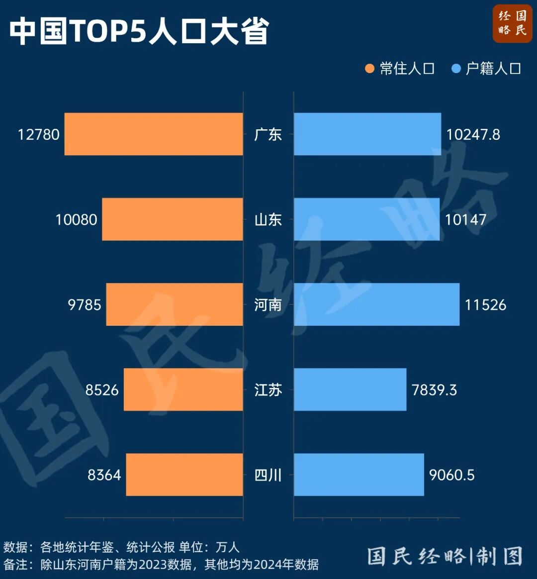 广东以1.27亿人连续多年位居全国第一,与日本全国相当;山东常住人口、河南户籍人口双双超过1亿人。
