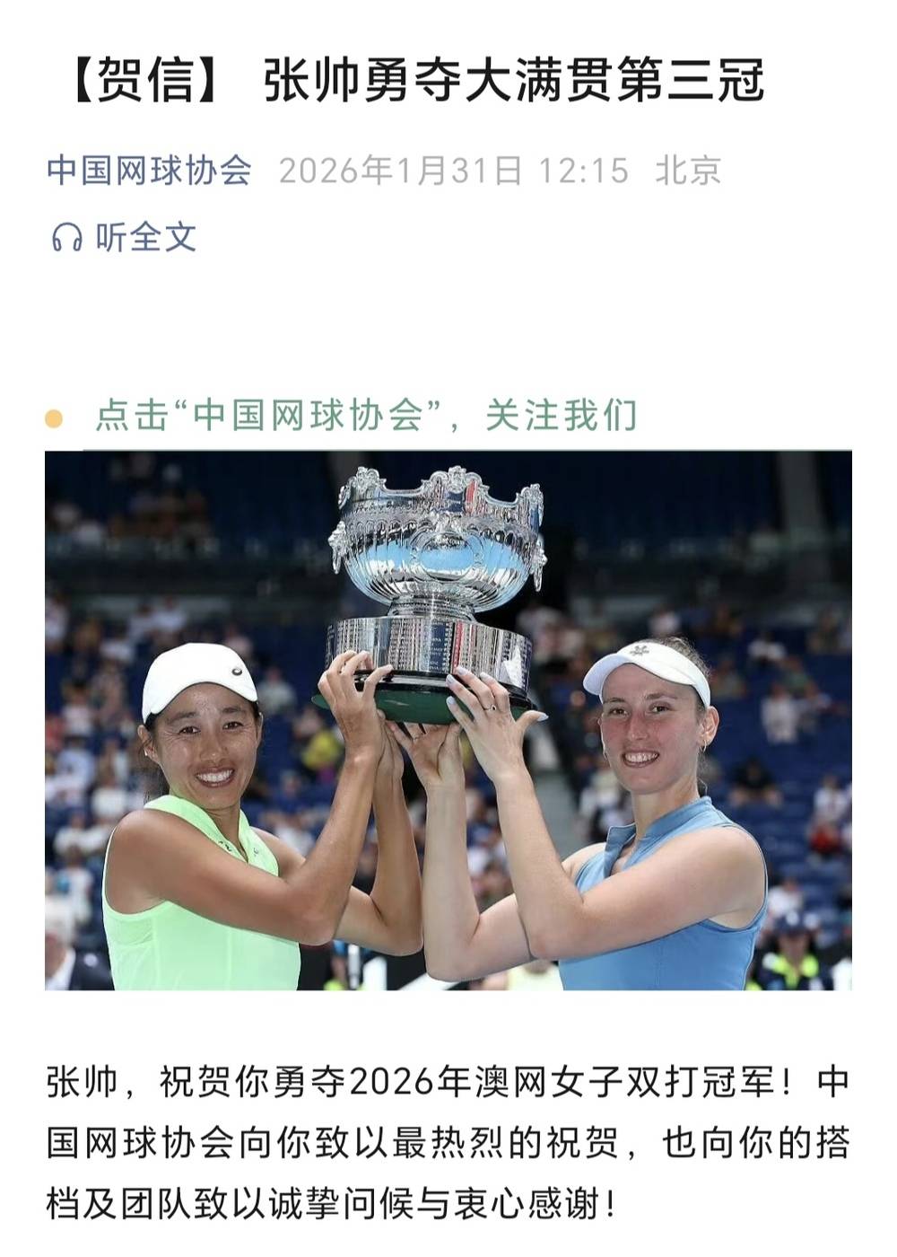 张帅,祝贺你勇夺2026年澳网女子双打冠军!中国网球协会向你致以最热烈的祝贺,也向你的搭档及团队致以诚挚问候与衷心感谢!