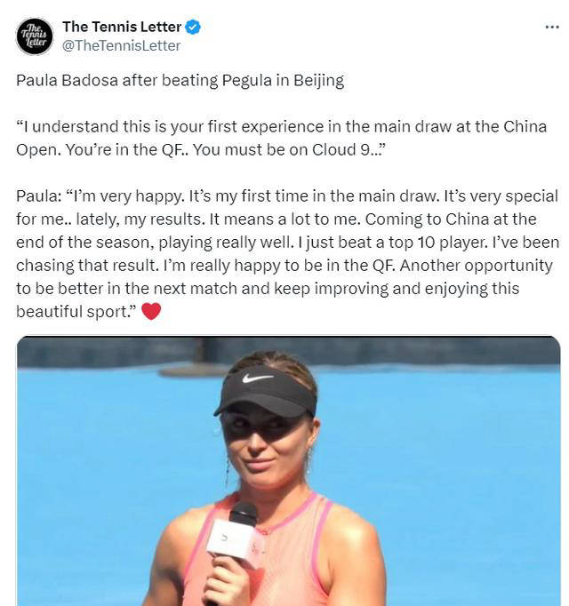 赛后接受采访时,巴多萨表示:“这是我第一次参加中国网球公开赛,我的经验还不够。能在首次参赛就闯入八强对我而言意义非凡,这是一个特别的时刻。在中国的比赛表现不错,我成功击败了世界前十的选手,这是我一直努力追求的结果。我将会继续努力,享受这项美丽的运动。”