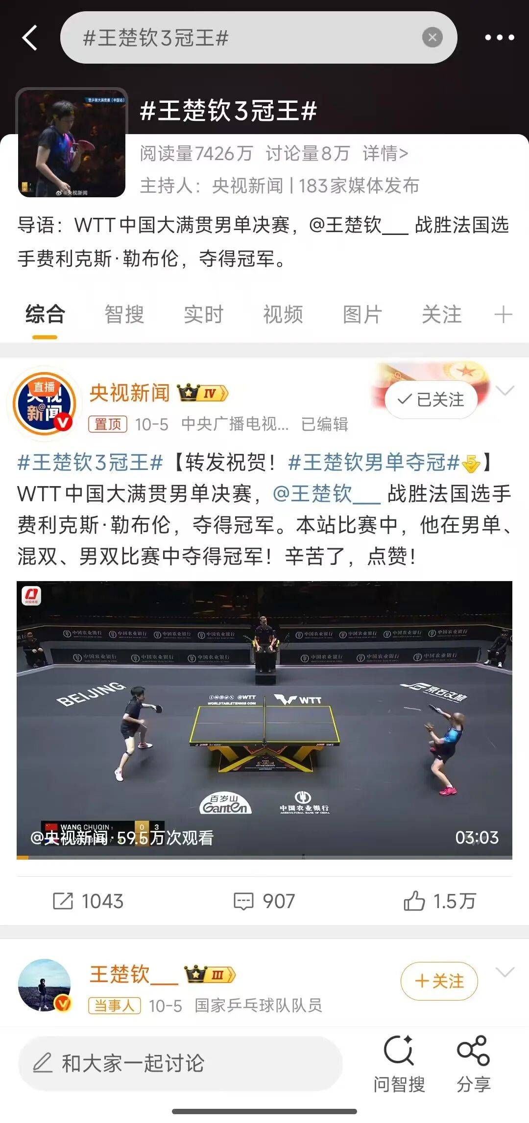 在乒乓球领域,微博也是球迷聊球的第一平台,国乒的每一场比赛都吸引了各方关注。@央视新闻@人民日报 等党央媒体在第一时间追踪报道国乒战绩。今年10月5日,当王楚钦拿下WTT中国大满贯冠军之后,@央视新闻 主持的线小时在榜,足见其受关注程度之高。